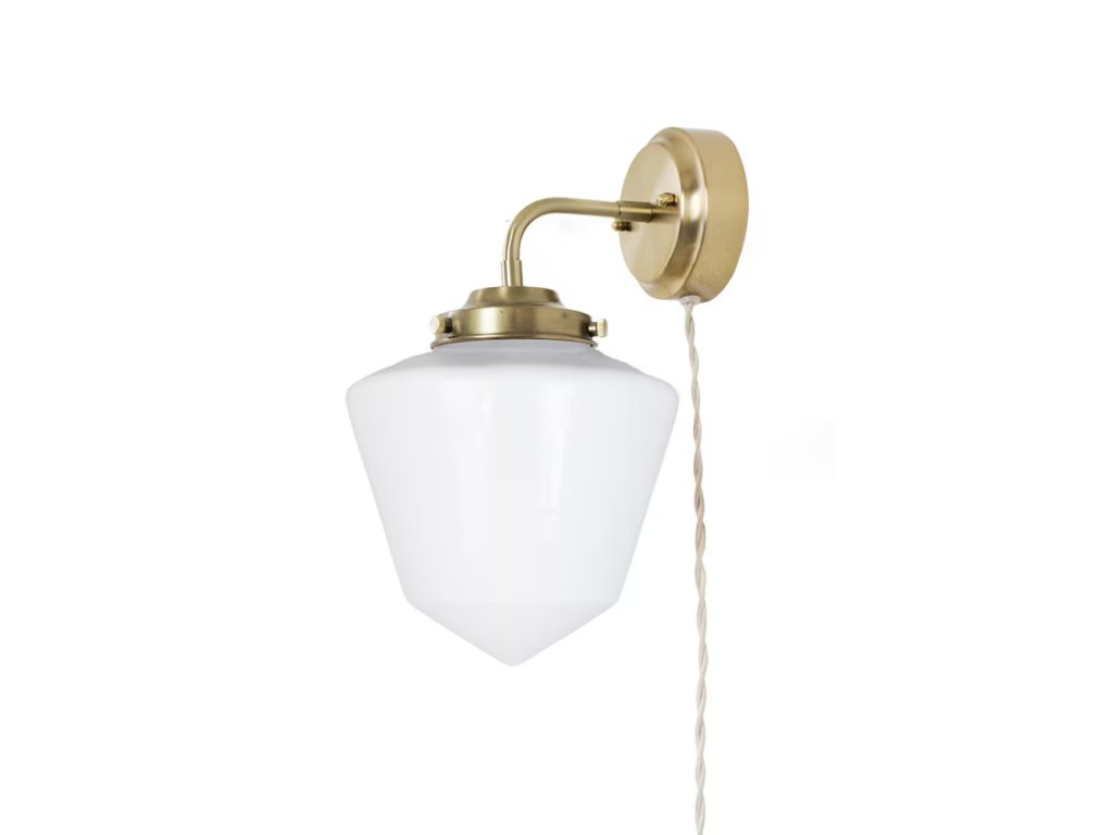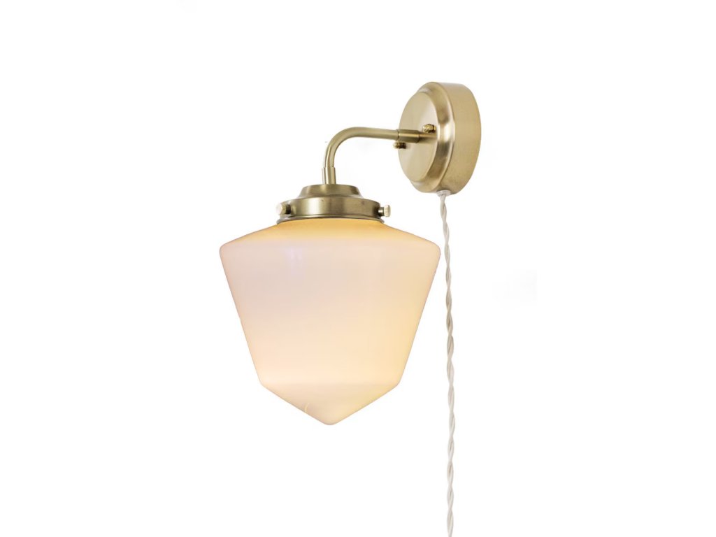 Elegantní nástěnná lampa s mosazným povrchem a kapkovitým opálovým sklem v bílém odstínu. Design inspirovaný přelomem 19. a 20. století vytváří příjemnou atmosféru v různých interiérech.