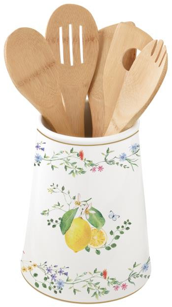 Stojan je vyroben z kvalitního porcelánu a doplněn dřevěnými kuchyňskými nástroji. Dekor Fleurs et Citrons kombinuje květinové a citrusové motivy, které dodávají stolování a kuchyni svěží a elegantní vzhled.